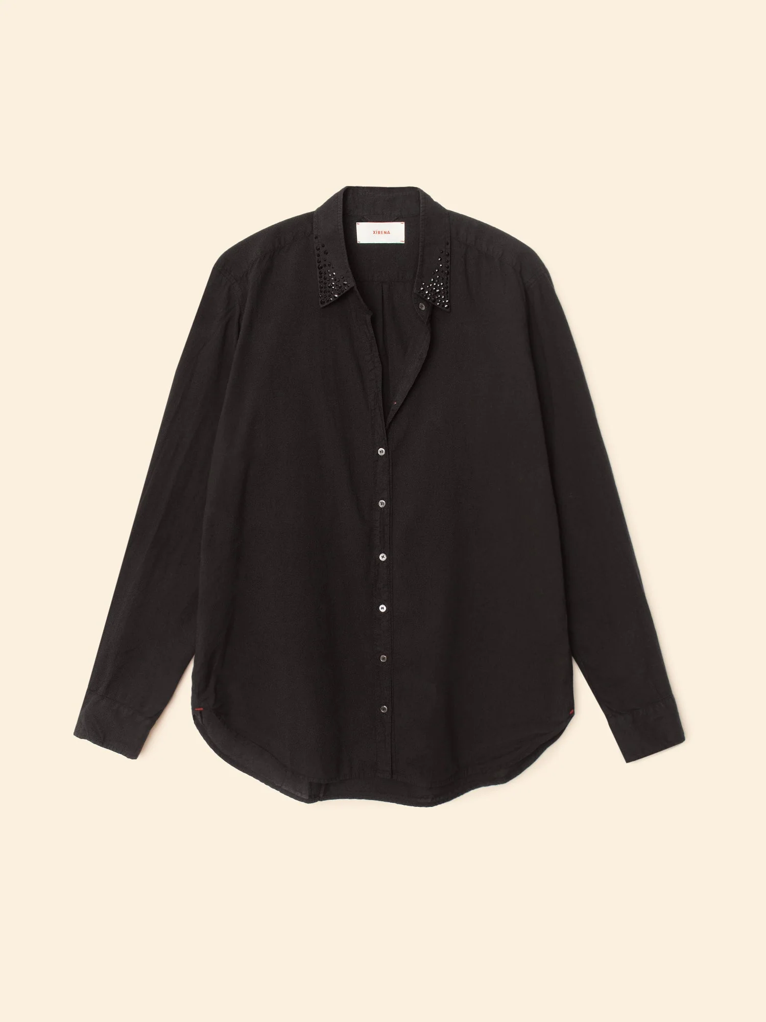 Hiddens Gems. Our bestselling Beau Shirt is embellished this season with crystal rhinestones on the shirt collar. Beau is quintessential Xirena and an essential basic. Made in our classic lightweight woven cotton poplin for a lived-in look and feel, the Beau Shirt has a menswear-inspired shape and is a must-have season after season.